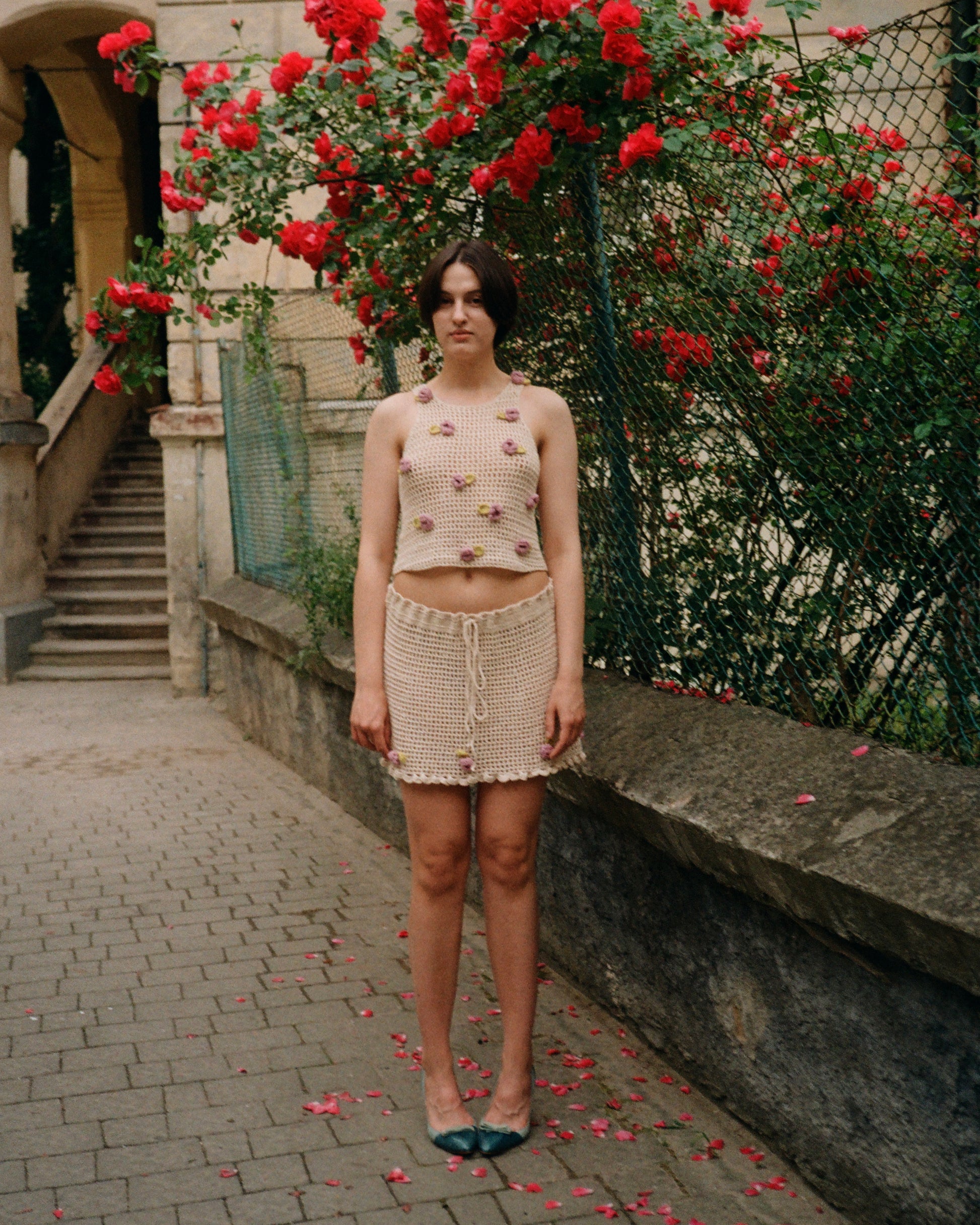 The base of this top is crocheted with a mesh pattern. It also features crochet pink roses on the front.