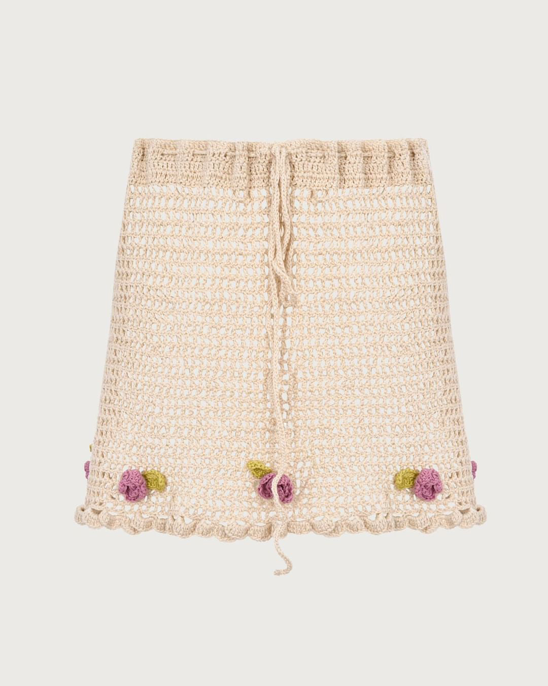 Hand-crocheted skirt with a mesh pattern. It also features crochet pink roses at the bottom. The skirt is equipped with a drawstring waist, allowing for adjustable sizing to fit various body types.