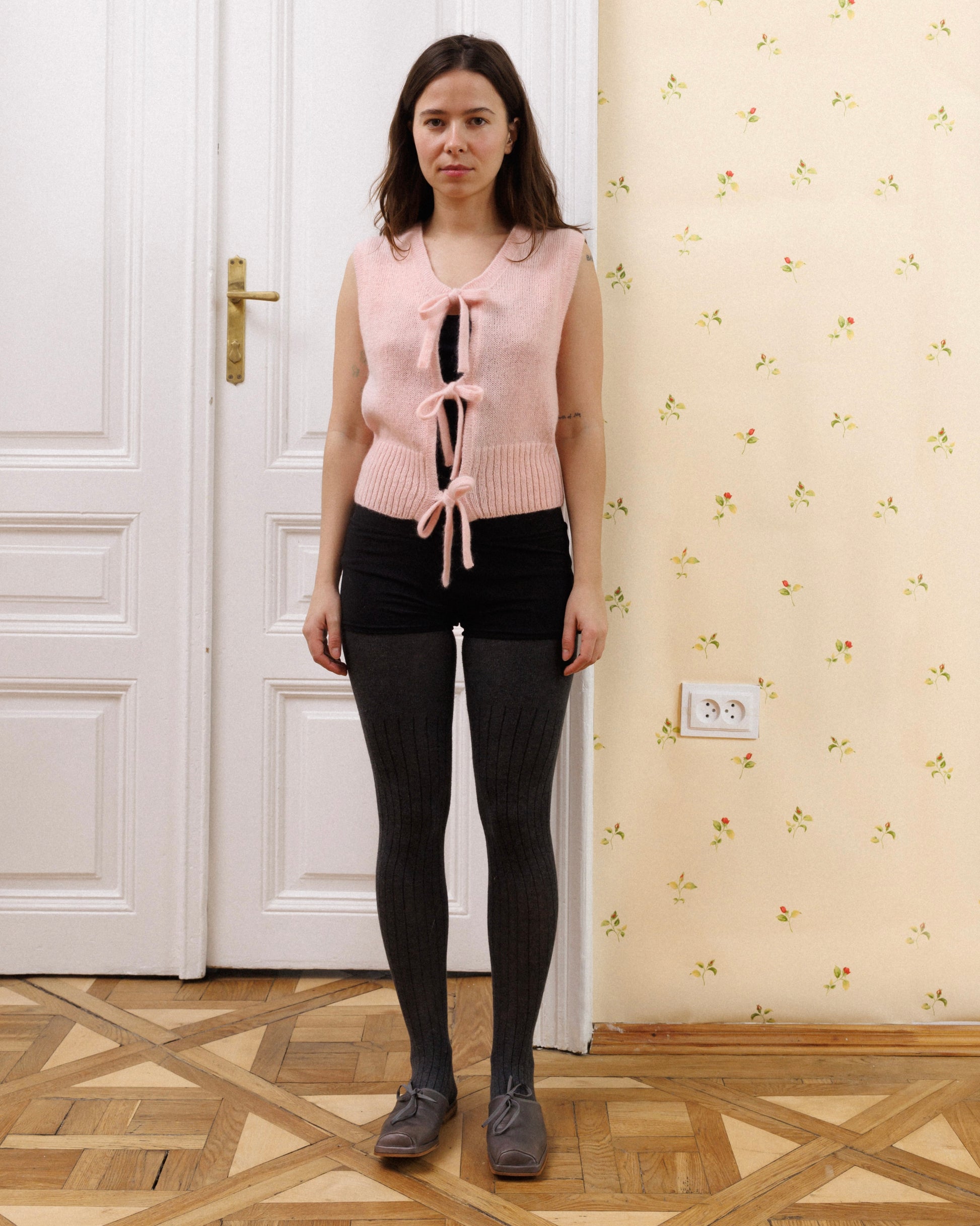 Knitted mohair vest with bows.