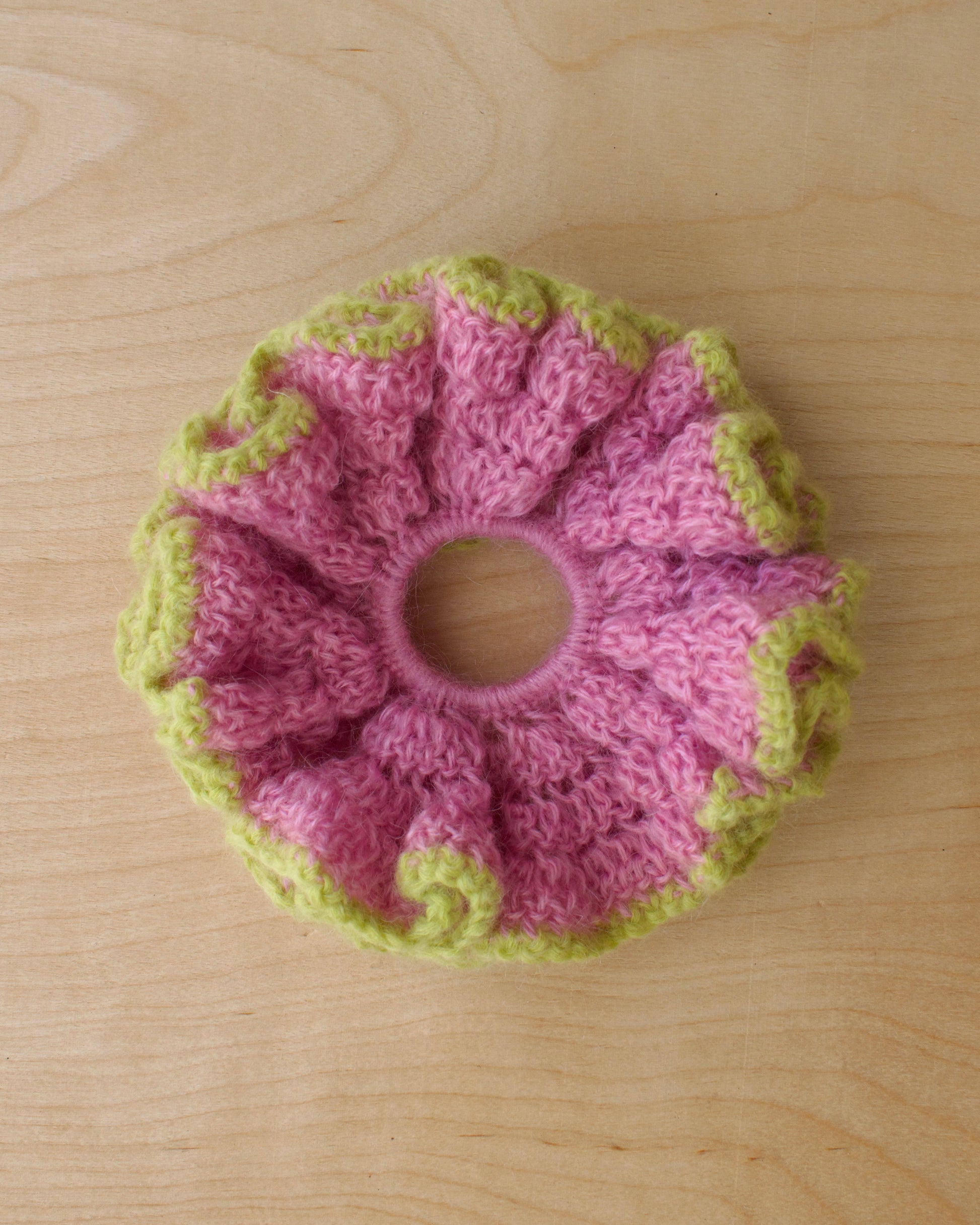 Oversize Hand crochet mohair scrunchie in light pink and lime.