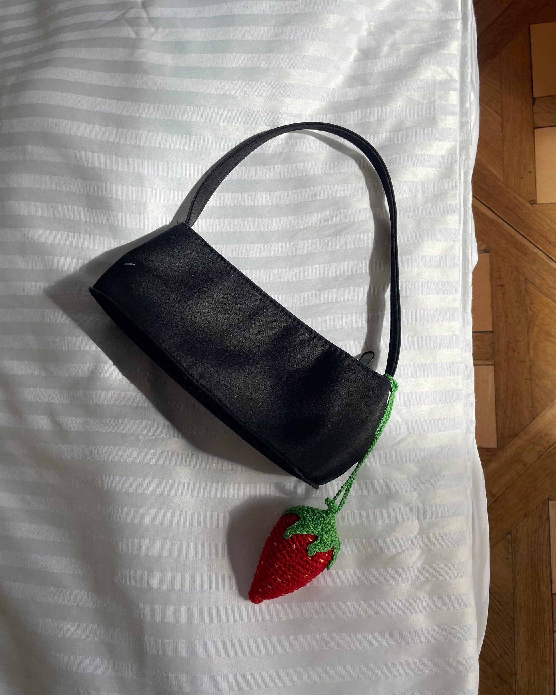 This playful crochet strawberry is the perfect touch for your outfits. Use it as a keychain or as a charming accessory for your bag or clothing.